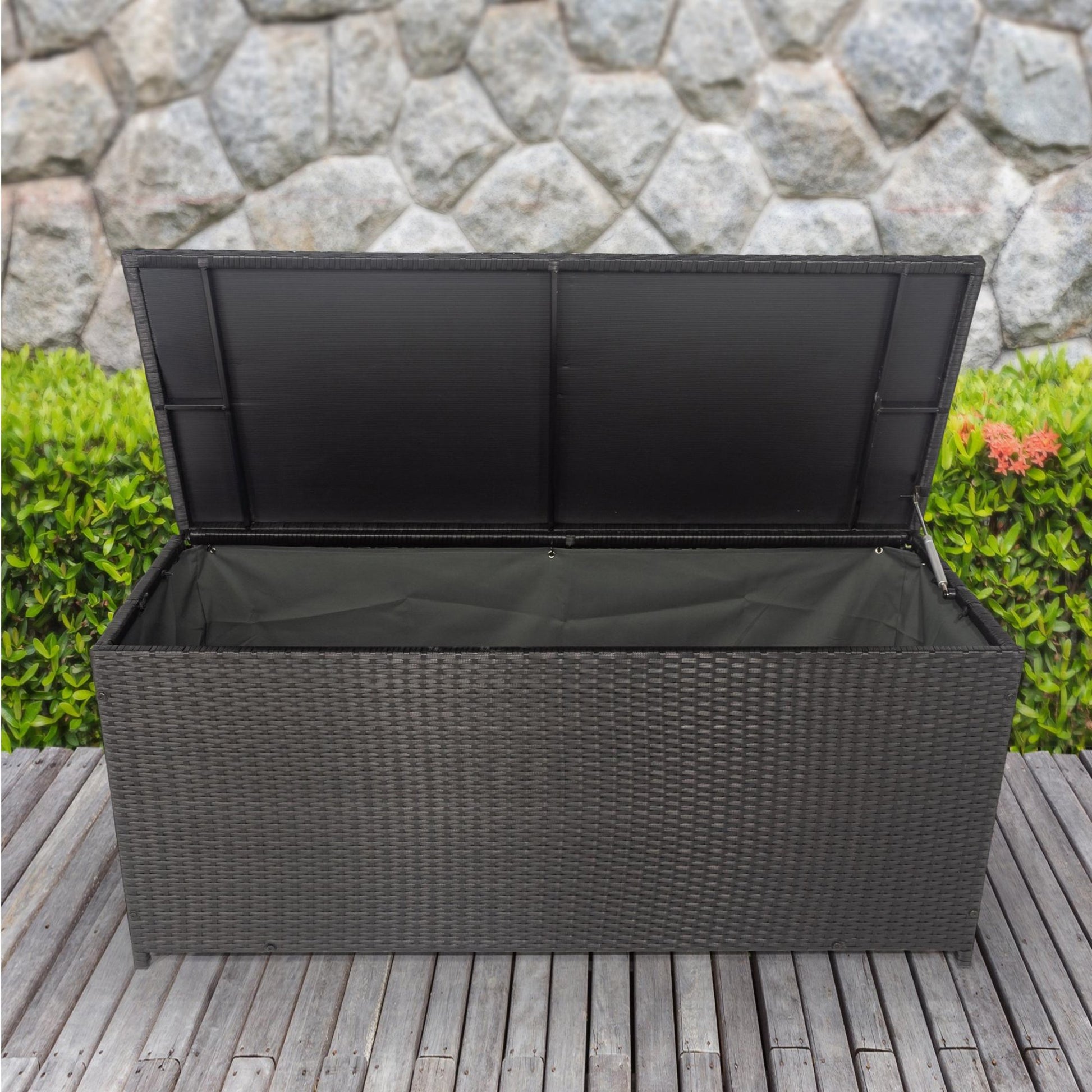With an impressive 113 gallon storage capacity, this versatile deck box keeps your essentials organized and protected. Ideal for garden tools, outdoor cushions, and poolside accessories, it features a removable, water-resistant liner suitable for decks, patios, porches, and indoor spaces. Made from lightweight rattan with a sturdy metal frame, the outdoor storage box is both durable and portable. Effortlessly move it to your desired location, and use it as a functional side table by simply closing the lid. Easy-Glide Hinges with air springs ensure smooth, safe opening and closing, making the waterproof deck box convenient even for kids. Enhance your storage capacity with style and convenience with our Extra Large Patio Storage Box.