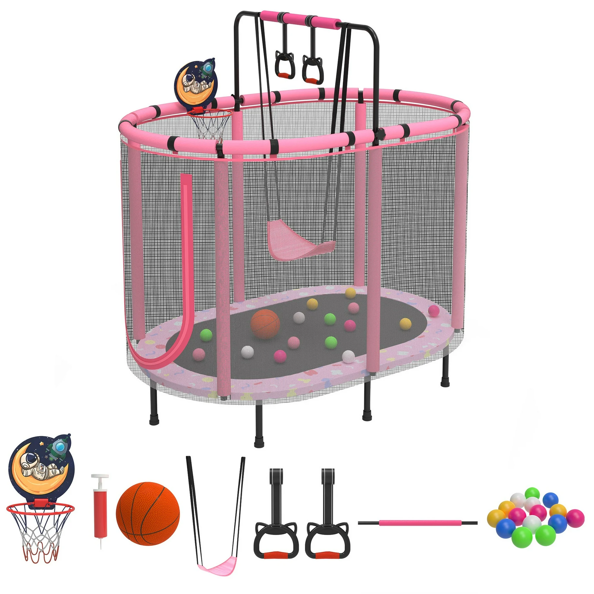 This 5-in-1 small trampoline measures 59.45"L x 40.55"W x 86.6"H, making it a perfect fit for indoor outdoor spaces. The springless bounce system uses 32 high-elasticity bungee bands on a heavy-duty U-shaped steel frame. This toddler trampoline comes as a complete set with basketball hoop, swing, rings, and balls, all protected by a no-gap enclosure net.