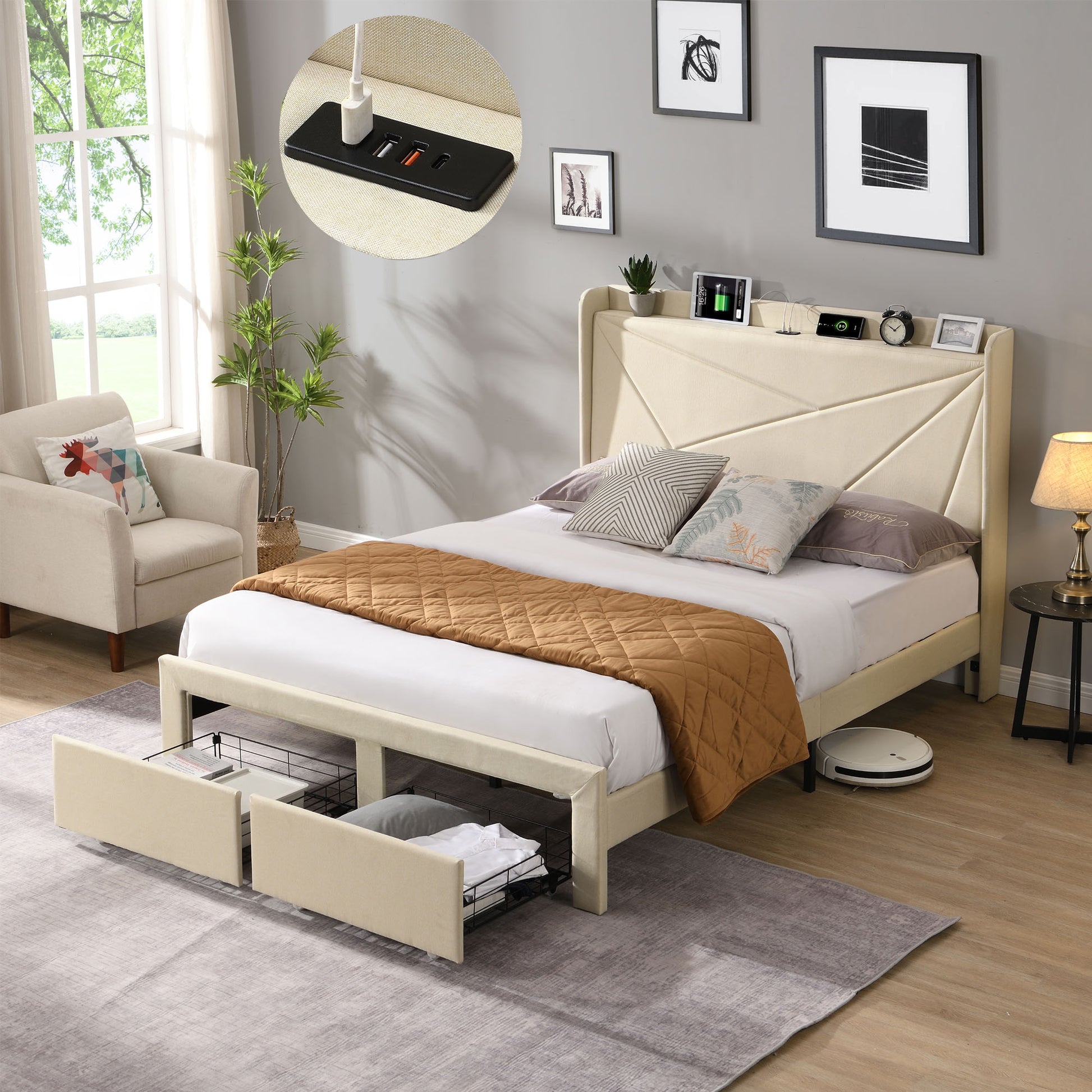 - BED FRAME WITH STORAGE - This storage full-size bed frame 2 roomy under-bed drawers with convenient rollers, providing ample storage space for linens, off-season clothing, and more. Additionally, the 2 tier headboard storage provides a practical space to keep common small items, such as remotes, within easy reach, ensuring easy access and organization.