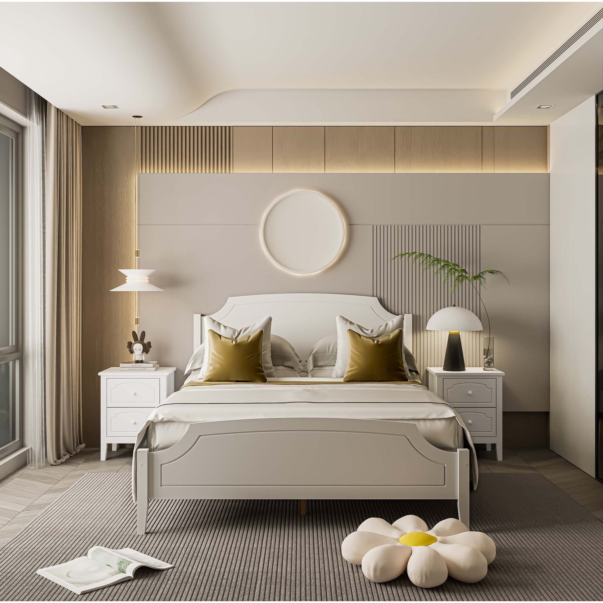 This bed frame features Roman accents, creating a platform bed that blends into a variety of decor styles. The carefully designed arched headboard and footboard, paired with a simple yet unique drawer front design, and every detail painted in white, are smooth to the touch and matte in texture, making this bed the focal point of the entire room. Lying on it is a wonderful enjoyment for your tired body. The headboard and footboard of this bed are made of MDF boards that have passed CARB testing and reached the P2 level to ensure safe use. The bed's legs and main structure are made of high-quality solid wood to ensure stability and durability. 3 different sizes (Full, Queen Size, King Size) for you to choose from to meet your family's different needs.