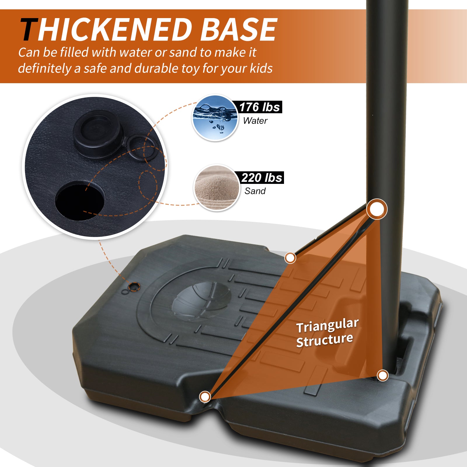 - 【Extra Large Stable Base】The large base ( Dimension: 35"(L)x 24"(W) x 6"(H)) equipped with 2 intakes for sand or water,making the basketball system more stable than others. What's more, with two transportation wheels, the whole system can be easily moved from indoor to outdoor.