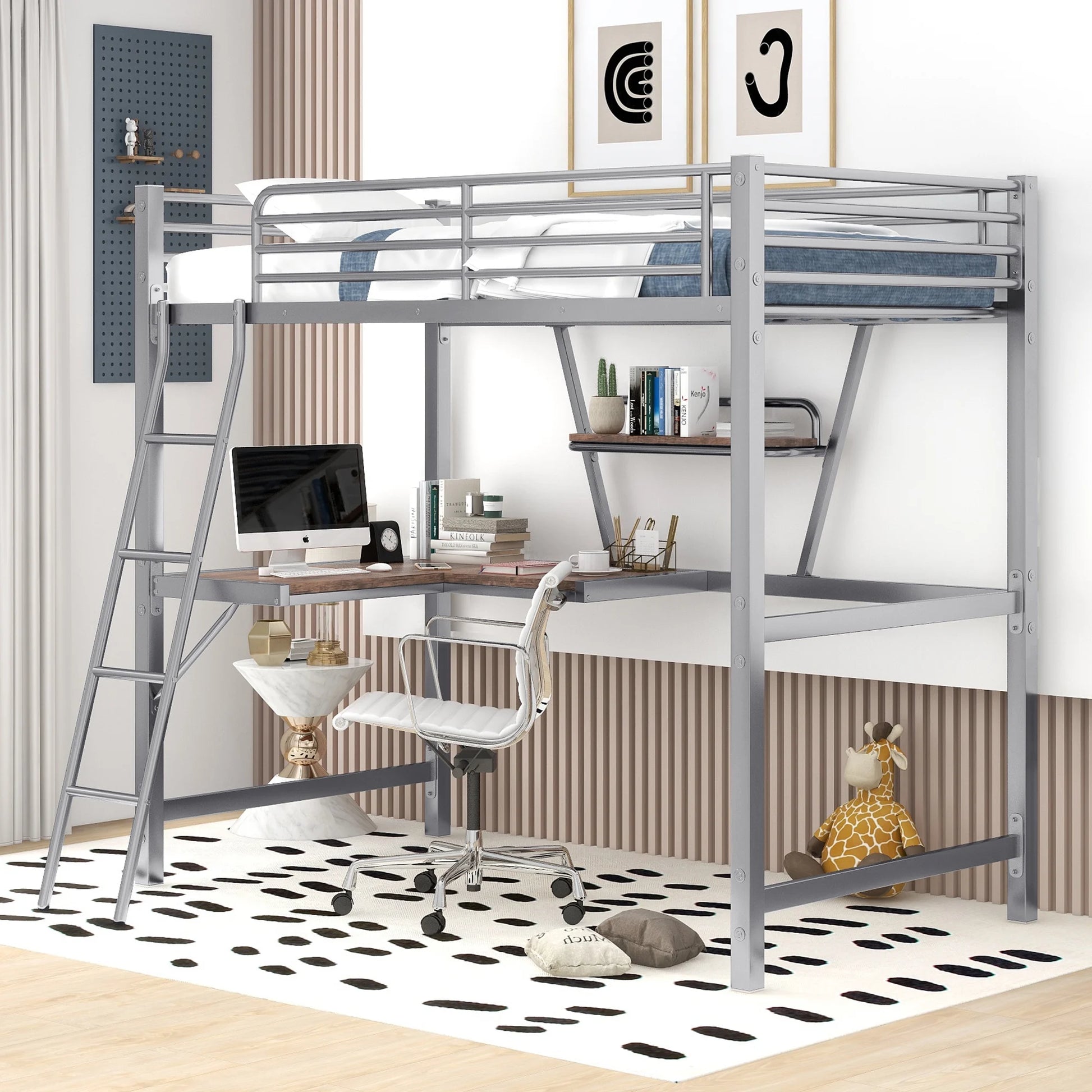 This stylish metal loft bed provides a comfortable place for children and teens to sleep and study. The sturdy metal frame comes with fixed metal slats, an integrated ladder, and full-length metal guardrails on the upper bunk for stability and safety. The loft bed features a smart desk with a shelf, perfect for homework, reading, writing, drawing, and other activities. Designed to maximize space, this loft bed features an integrated desk and shelf underneath, perfect for homework, reading, writing, drawing, and other activities to create a personal workstation. Plus, with its clean painted finish and simple lines, the bed will fit right in any style of bedroom. Thanks to the metal slat system, there's no need for a box spring - just place a standard mattress of your choice on top.