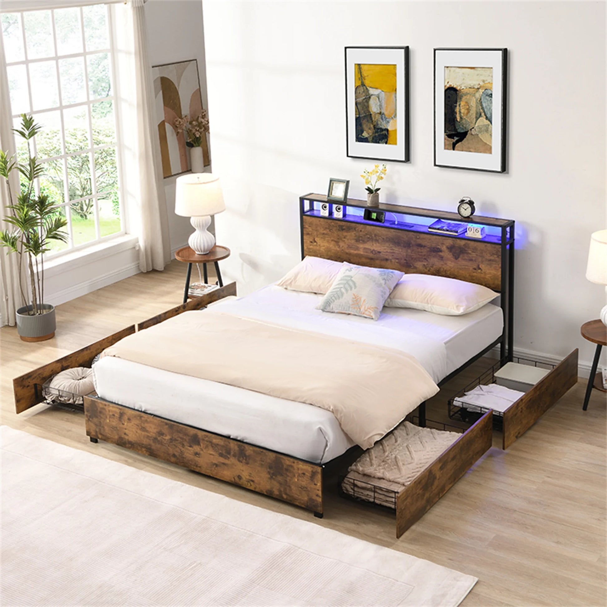 Full Size Bed Frame with Headboard and Charging Station, Platform Bed Frame with 4 Storage Drawers, Stable Metal Bed Frame with LED Lights, Noise Free, No Box Spring Needed, Easy Assembly, Brown